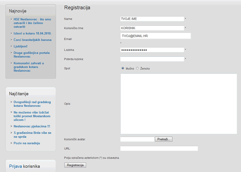 Klikom na jedan od dva natpisa "Registracija" na naslovnici otvori se obrazac za registraciju. Upišite svoje ime i prezime, korisničko ime koje želite, e-mail adresu te lozinku dva puta. Možete odabrati i svoj avatar. Polja označena asteriskom (*) su obavezna.