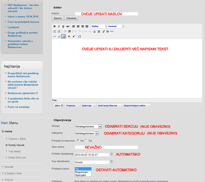 Ovo je vrlo jednostavno i nebi trebalo plašiti nikoga. Slobodno probajte, pišite, ne možete ništa pokvariti. Administrator će ispraviti eventualne greške u tekstovima, te ih prilagoditi za objavljivanje po potrebi.