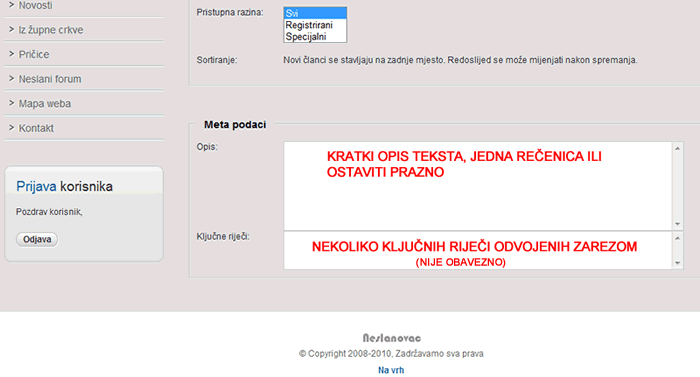 U dnu stranice su "Meta podaci" (slika 5). To su ustvari podaci o podacima, tj. možete, ali ne morate upisati kratki opis teksta u polje "Opis", a dobro je upisati poneku ključnu riječ kako bi pretraživači kao Google, Yahoo itd. bolje indeksirali vaše stranice. Ključne riječi su u stvari najvažnije riječi u tekstu, npr: škola, osnovna škola, Ravne njive, učenici, radovi učenika ..... itd. ovisno o čemu pišete tekst.