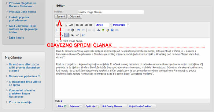 Na kraju obavezno treba kliknuti na "Spremi" (nalazi se u "Editoru" iznad teksta, slika 7) i time će tekst biti upisan u bazu podataka i stavljen na listu čekanja za objavljivanje. Čim ga urednik pregleda i odobri, postat će javan i dostupan za čitanje svima.