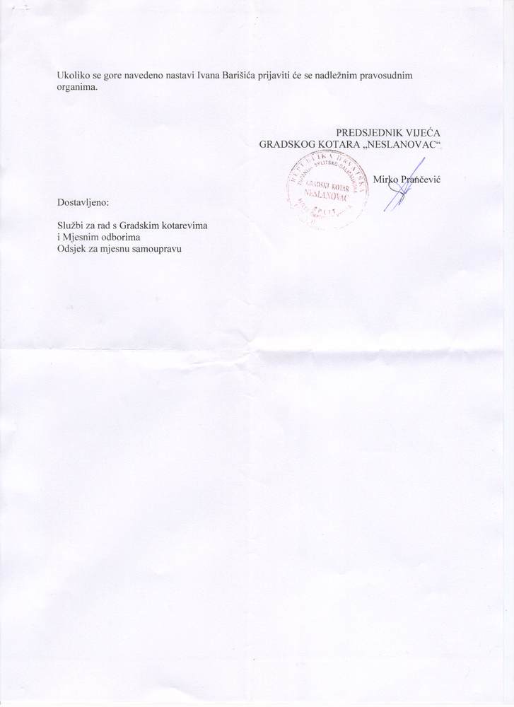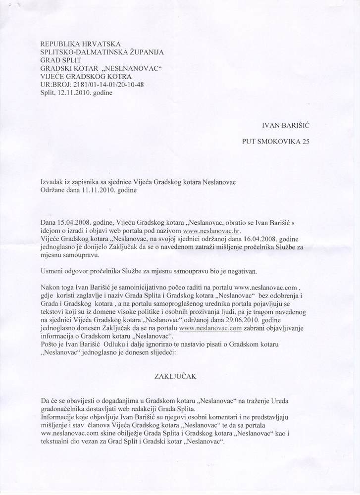 Dvogodišnji "pregovori" Nakon dvije godine usmenih razgovora,službeno se dopisom gradskom kotaru obratio 15. studenog. Među ostalim predložio je i objavljivanje zapisnika sa sjednica Vijeća GK Neslanovac. Ponudio je i objavljivanje informacija i tekstova, bez ikakve intervencije urednika, jer portal ima tehničke mogućnosti za to. |